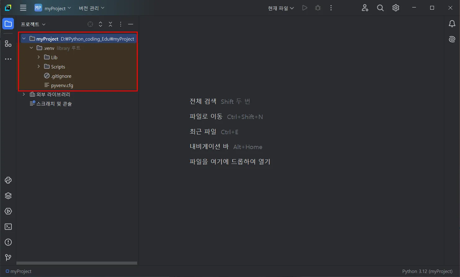 프로젝트가 만들어지면, ". venv" 폴더가 생기는데, 이것은 가상 환경(Virtual environment)을 의미하는 것으로 앞에서 언급했듯이 프로젝트별로 독립적인 파이썬 실행 환경을 제공하기 위한 것이다.